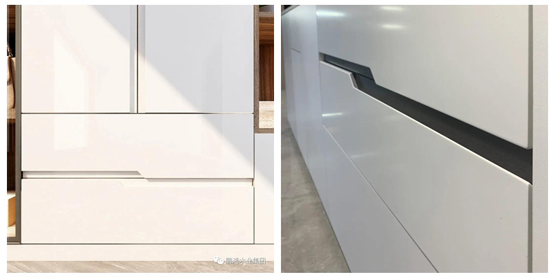 45°角的內(nèi)向斜切,25mm槽寬,隱形的凹槽式拉手化有形于無形,符合人體工程學(xué),保證每次柜門開合時的舒適手感。